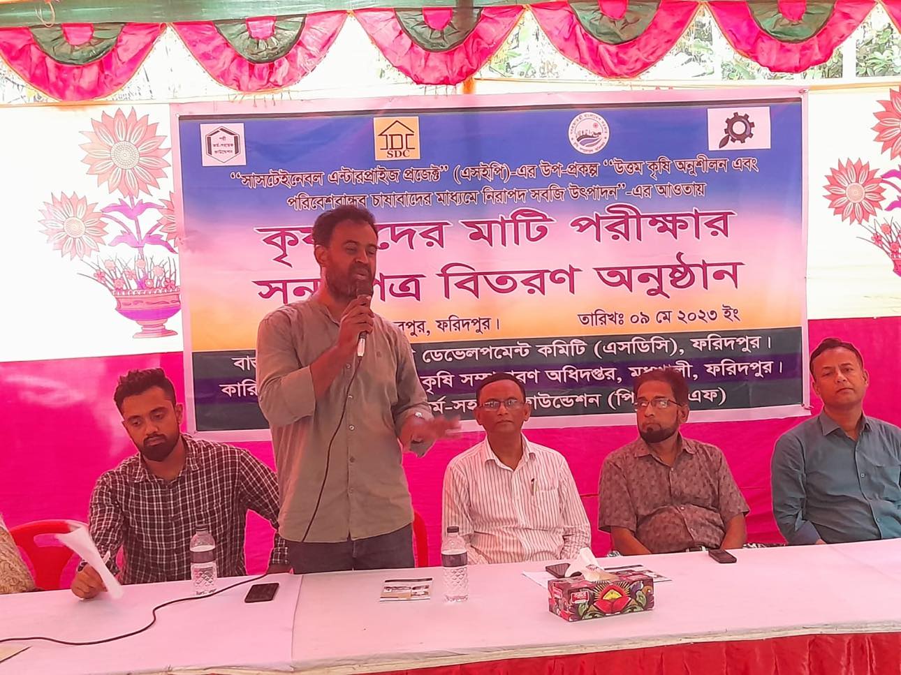 বিশ্ব ব্যাংকের অর্থায়নে ও পল্লী কর্ম-সহায়ক ফাউন্ডেশন (পিকেএসএফ)-এর সহযোগিতায় সাসটেইনেবল এন্টারপ্রাইজ প্রজেক্ট (এসইপি)-এর আওতায় বেসরকারী উন্নয়ন সংস্থা সোসাইটি ডেভেলপমেন্ট কমিটি (এসডিসি)-এর আয়োজনে ফরিদপুর জেলার সদরপুর উপজেলায় যাত্রাবাড়ি গ্রামে নিরাপদ সবজি চাষীদের জমির মাটি পরীক্ষার সনদপত্র বিতরণের এক অনুষ্ঠানের আয়োজন করা হয়। উক্ত অনুষ্ঠানে প্রধান অতিথি হিসাবে উপস্থিত ছিলেন কৃষিবিদ জনাব মোঃ জিয়াউল হক, উপ-পরিচালক, কৃষি সম্প্রসারণ অধিদপ্তর, খামারবাড়ি, ফরিদপুর। বিশেষ অতিথি হিসেবে উপস্থিত ছিলেন কৃষিবিদ ডঃ মোঃ নুরুল হুদা আল মামুন, প্রধান বৈজ্ঞানিক কর্মকর্তা, আঞ্চলিক মৃত্তিকা গবেষণাগার, ফরিদপুর এবং কৃষিবিদ ড. সেলিম আহম্মেদ, প্রধান বৈজ্ঞানিক কর্মকর্তা, সরেজমিন গবেষণা বিভাগ, বিএআরআই, ফরিদপুর। উক্ত অনুষ্ঠানে সভাপতিত্ব করেন জনাব খন্দকার হামিদুল ইসলাম, পরিচালক (সার্বিক), এসডিসি, ফরিদপুর। স্বাগত বক্তব্য প্রদান করেন কৃষিবিদ মোঃ রফিকুল ইসলাম, প্রজেক্ট ম্যানেজার, সাসটেইনেবল এন্টারপ্রাইজ প্রজেক্ট (এসইপি), এসডিসি, ফরিদপুর। উক্ত অনুষ্ঠানে নানামুখী দিকনির্দেশনা মূলক বক্তব্য প্রদান করেন প্রধান বৈজ্ঞানিক কর্মকর্তা, আঞ্চিলিক মৃত্তিকা গবেষণাগার, ফরিদপুর, কৃষিবিদ ডঃ মোঃ নুরুল হুদা আল মামুন। প্রধান অতিথি কৃষিবিদ জনাব মোঃ জিয়াউল হক, উপ-পরিচালক, কৃষি সম্প্রসারণ অধিদপ্তর, খামারবাড়ি, ফরিদপুর তাঁর বক্তব্যে বলেন, ”নিয়মিত মাটি পরীক্ষার মাধ্যমে পরিমিত পরিমাণে রাসায়নিক সার ব্যবহার এবং অধিক পরিমাণে জৈব সার ও জৈব বালাইনাশক ব্যবহার করতে হবে”। তিনি সবশেষে উপস্থিত কৃষক-কৃষাণীর মধ্যে মাটি পরীক্ষার সনদপত্র বিতরণ করেন এবং সকলকে ধন্যবাদ জানিয়ে তাঁর মূল্যবান বক্তব্য শেষ করেন।