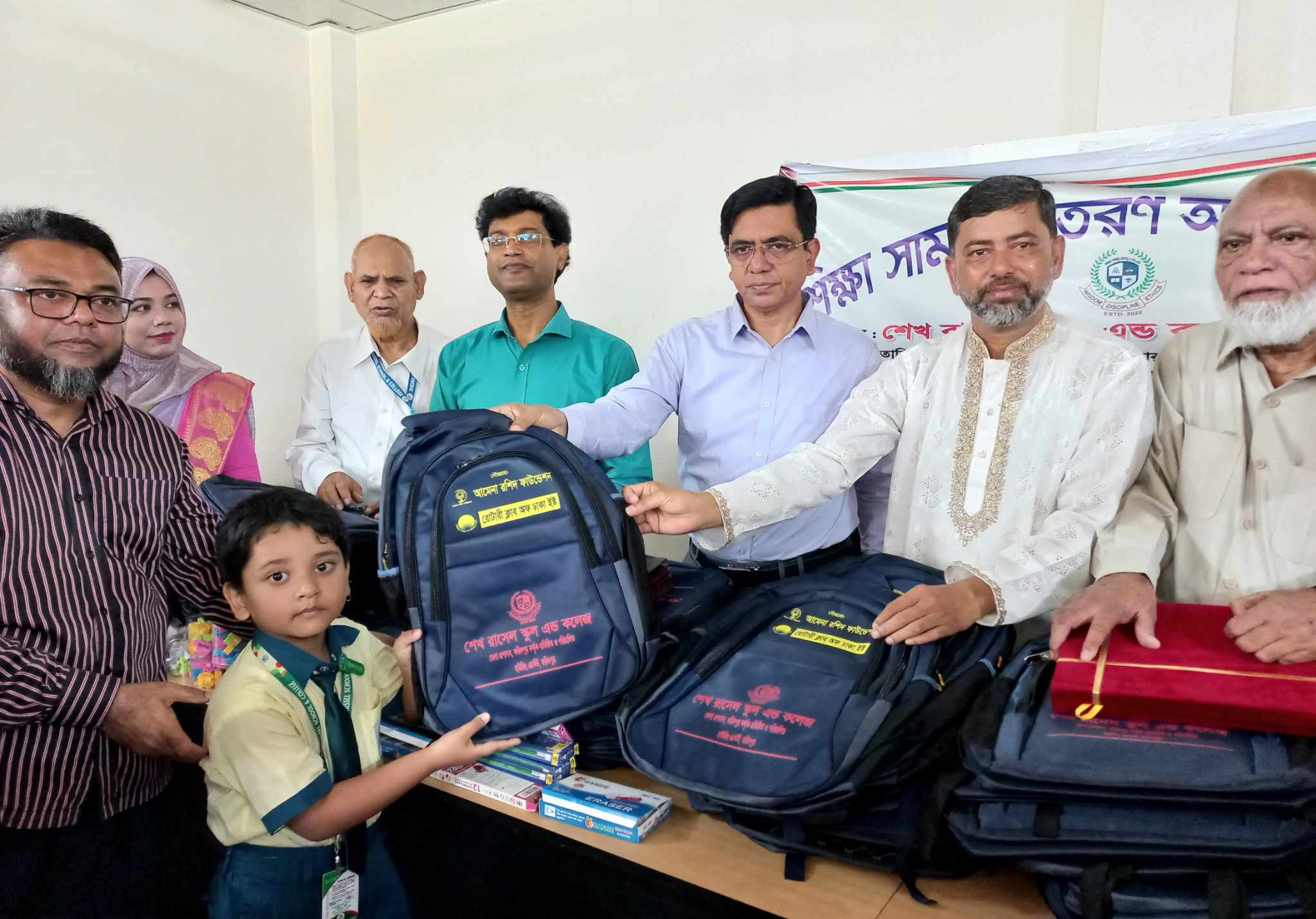 ফরিদপুরে শেখ রাসেল স্কুল এন্ড কলেজে শিক্ষার্থীদের মাঝে আমেনা-রশিদ ফাউন্ডেশনের প্রতিষ্ঠাতা ইদ্রিস আলী মোল্যা ও রোটারী ক্লাব অফ ঢাকা ইষ্ঠ এর সৌজন্যে শিক্ষা সামগ্রী হিসাবে স্কুলব্যাগ,কলম, পেন্সিল,স্কেল, ইরেজার, শার্প নার বিতরণ করা হয়েছে।