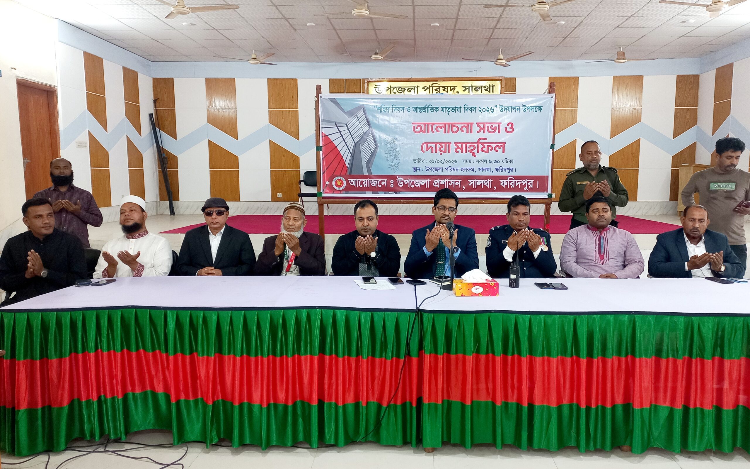 ফরিদপুরের সালথায় নানা আয়োজনে মহান শহিদ দিবস ও আন্তর্জাতিক মাতৃভাষা দিবস ২০২৬ইং পালিত হয়েছে। উপজেলা প্রশাসনের আয়োজনে শনিবার (২১শে ফেব্রুয়ারি) প্রথম প্রহর রাত ১২টা ১মিনিটে উপজেলা পরিষদের শহিদ মিনারে পুষ্পস্তবক অর্পণ দিয়ে শ্রদ্ধা জানানো হয়।