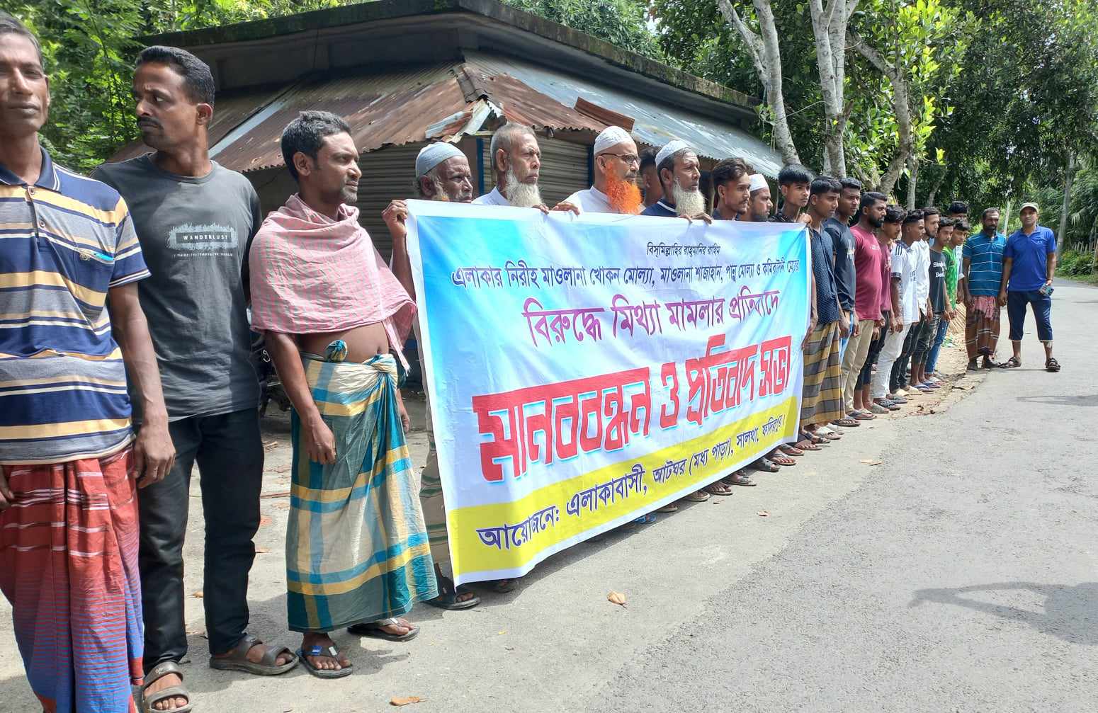 ফরিদপুরের সালথা উপজেলার আটঘর ইউনিয়নে মসজিদের ইমাম সহ নিরীহ গ্রামবাসীর বিরুদ্ধে মিথ্যা মামলা দায়েরের প্রতিবাদে মানববন্ধন করেছেন গ্রামবাসী। মঙ্গলবার (৩ সেপ্টেম্বর) দুপুরে সালথা-আটঘর আঞ্চলিক সড়কের মধ্যপাড়ায় এ মানববন্ধন করা হয়।